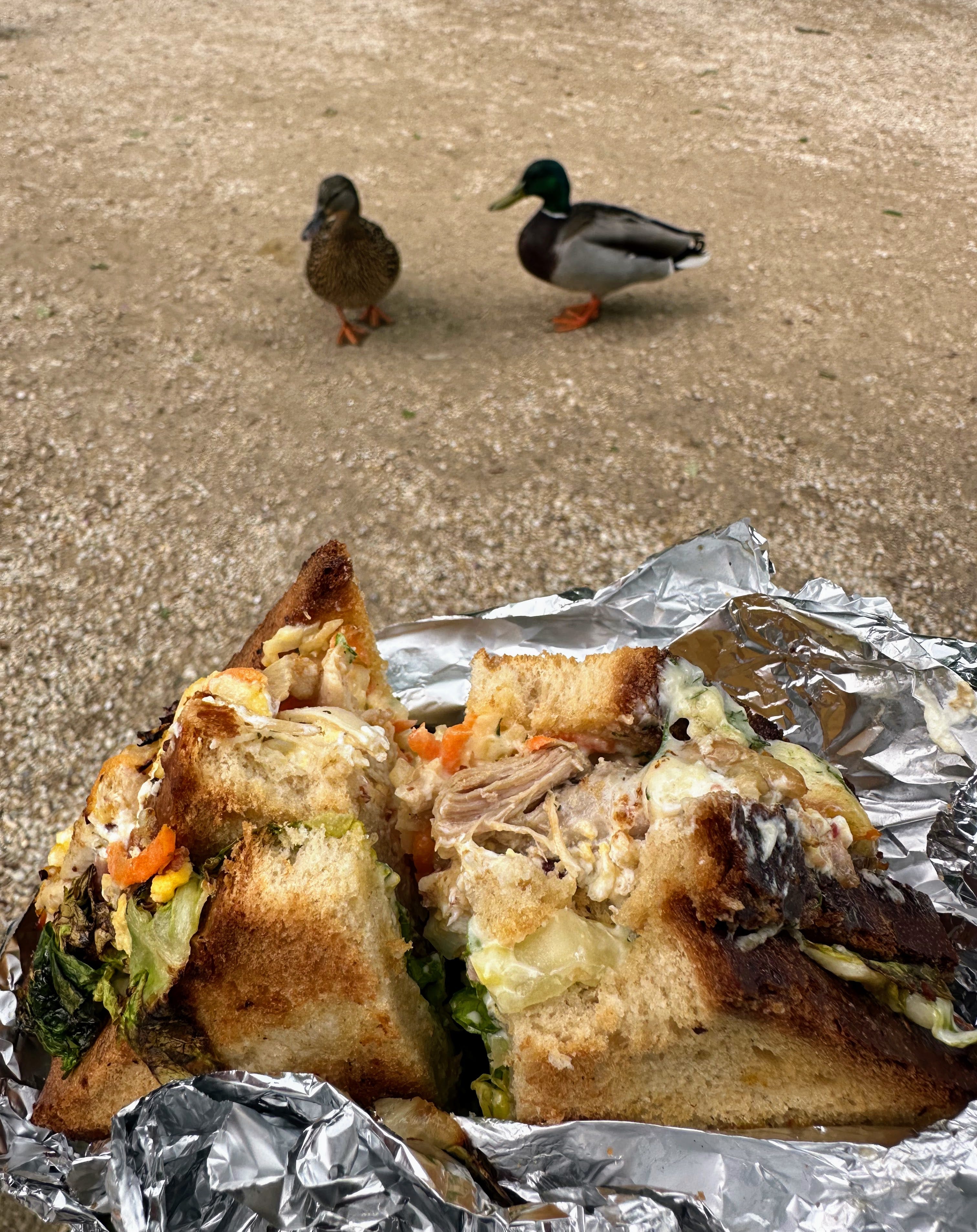 Déjà, le pain de mie, bien grillé et extrèmement croustillant. C’est ce qui me marque le plus. On est sur un pain de mie proche d’une biscotte moelleuse. J’adore. À l’intérieur, du poulet effiloché, des carottes rapées, de la mayonnaise aux herbes, des œufs durs, du fromage frais et du lard fumé. Autant vous dire qu’on est bien, très très bien. C’est presque difficile à finir tellement c’est généreux, mais tellement bon que ça passe.