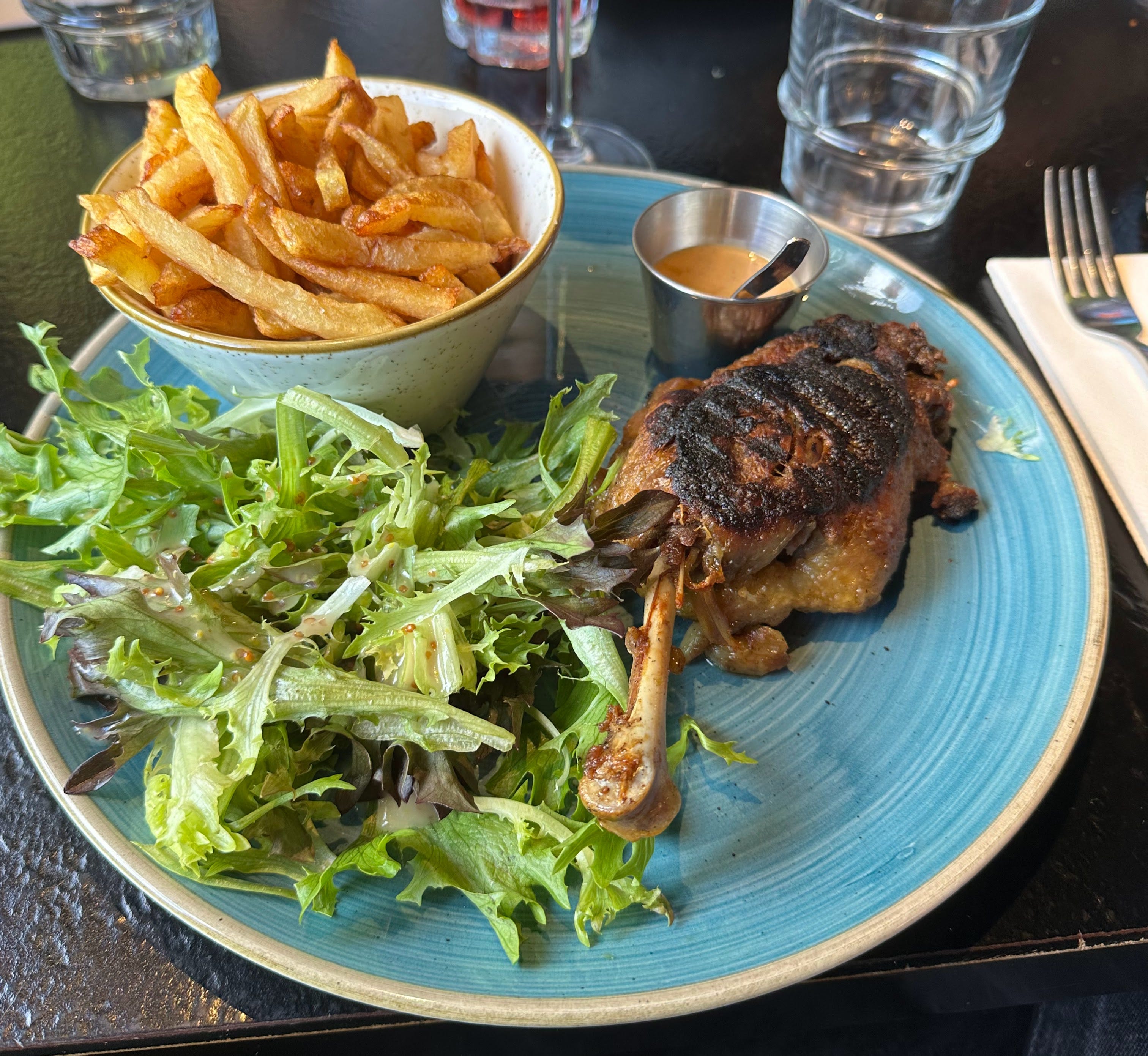 Me voilà donc en présence d’une cuisse de canard qui a été vraisemblablement jetée dans une poêle brulante et a pris un coup de chaud. L’accompagnement est un probable hommage à la fameuse salade de bienvenue de Courtepaille, avec un assaisonnement légèrement sucré déroutant. Les frites sont plutôt bonnes, et la sauce au poivre, sortie tout droit d’un berlingo de chez Metro, me rends circonspect.