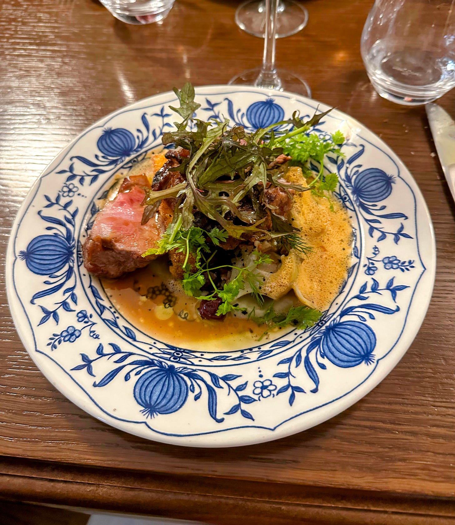 Pour le plat, j’enchaîne avec la plume de cochon ibérique, barigoule d’artichaut, polenta frite, nduja et olives. Beaucoup de choses dans l’intitulé, un peu plus fouilli dans l’assiette, mais le rendu est tout de même très bon.