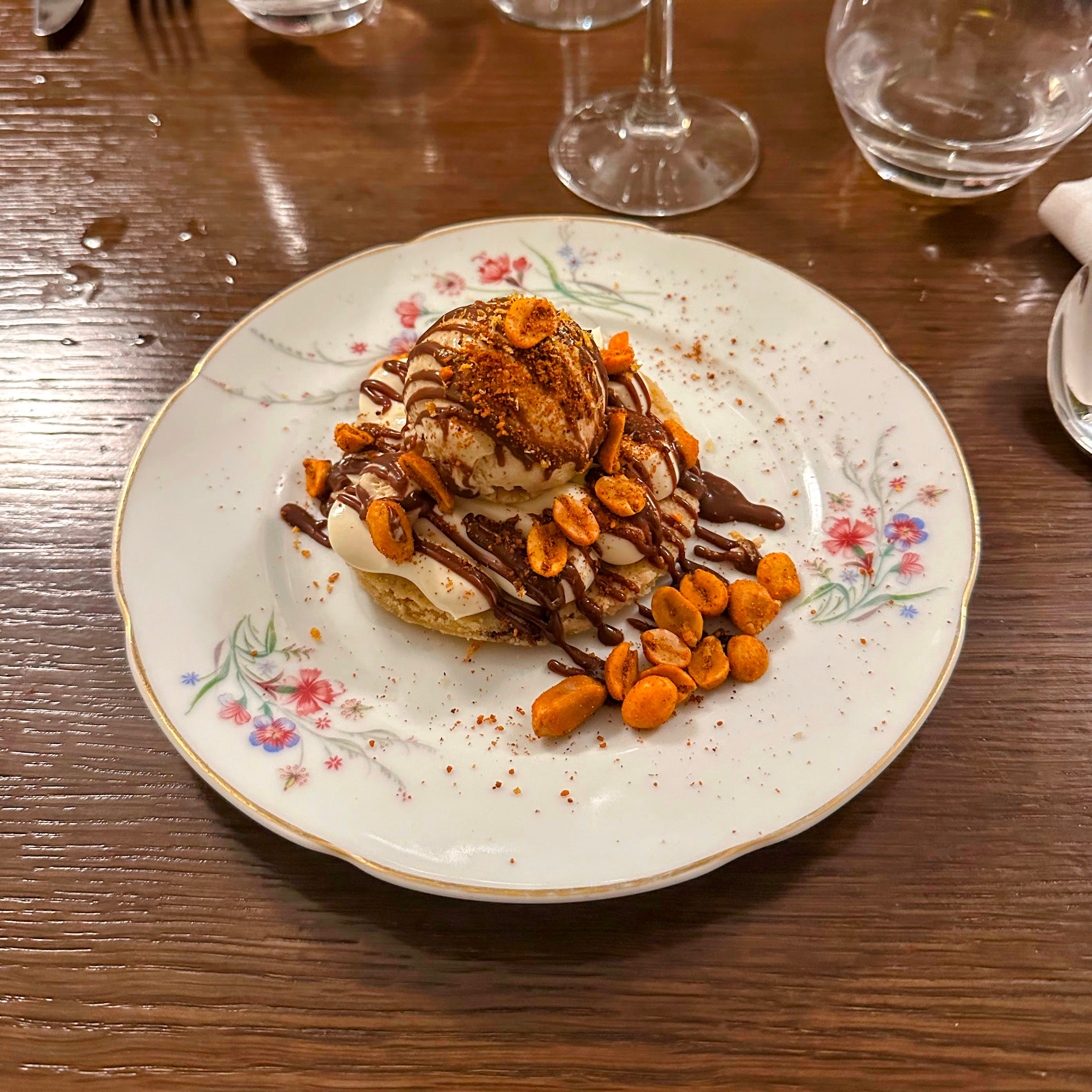 Le dessert est coquin: biscuit cacahuète, crémeux chocolat blanc et glace au pain.