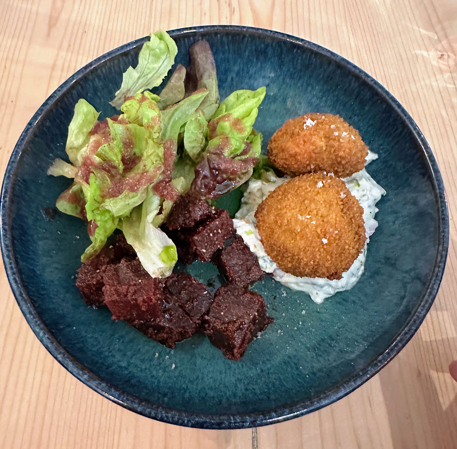 Les cromesquis sont bons, gourmands et bien garnis. La betterave est bien cuite, peu assaisonnée, mais accompagne bien le plat. La salade a peu d’intérêt, tartinée de sa vinaigrette très classique. Je regrette un léger manque d’acidité sur le fromage frais qui pourrait casser le gras de la friture, mais c’est un détail.