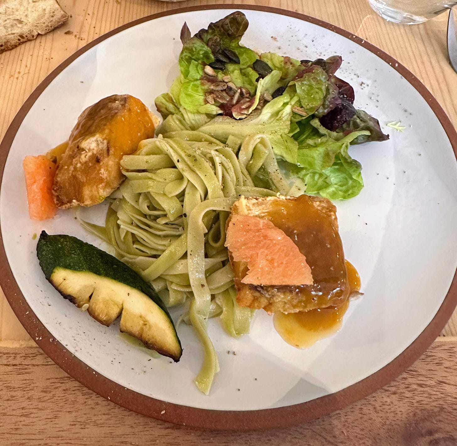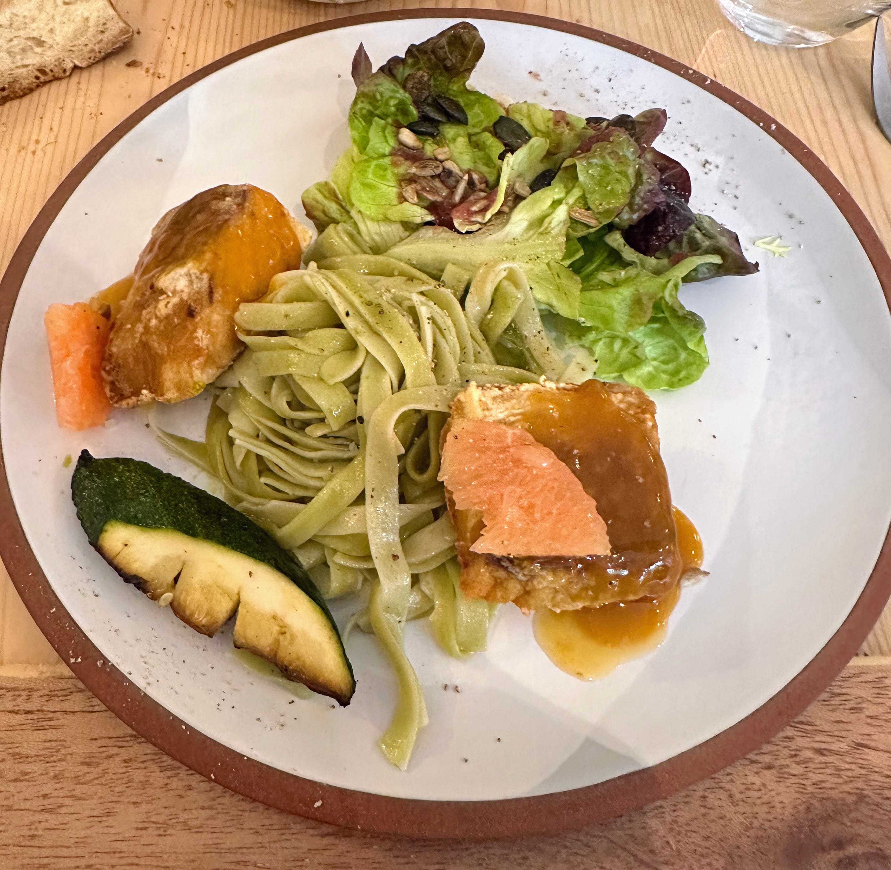 S’ensuit le plat qui arrive avec un peu de retard. La présentation laisse vraiment à désirer. La salade de l’entrée fait son retour, avec encore moins d’intérêt dans ce plat. Les nouilles sont collantes, plutôt fade et sans grand intérêt. Les légumes de saisons se compose d’un simple morceau de courgette grillé.