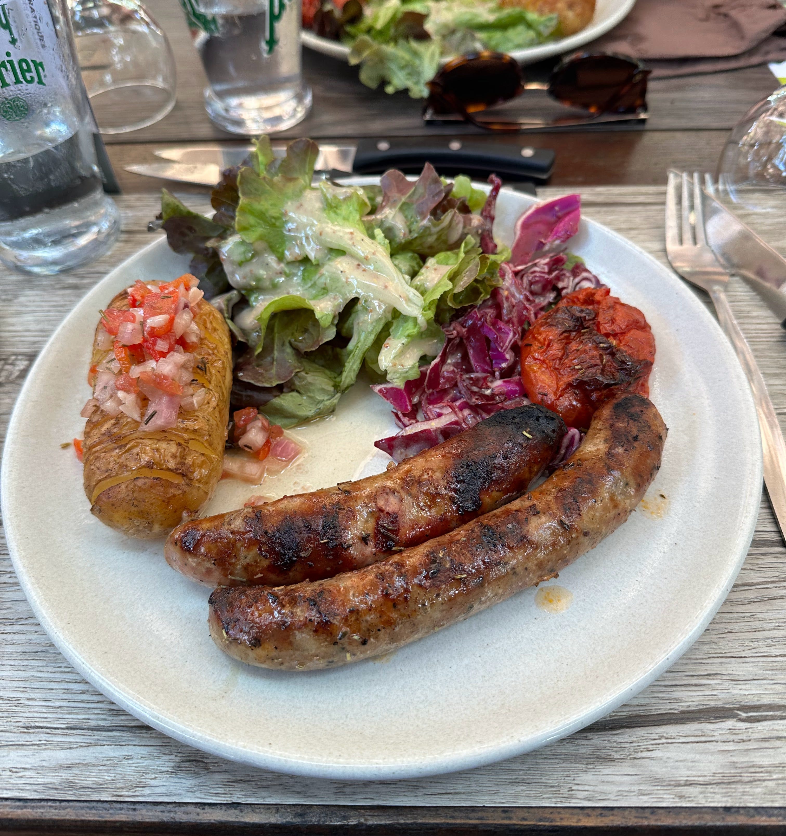 Les saucisses du Quercy sont bonnes, grillés, et servi avec une pomme de terre et une petite salade. Pas d’esbroufe, une assiette simple, efficace, qui vous ragaillardira pour la suite de vos visites. Le menu enfant, saucisse frites, laisse quant à lui à désirer: les frites sont légèrement rances, la saucisse sèche car trop cuite. Les desserts sont passables, le service un peu perdu, mais qu’importe.
