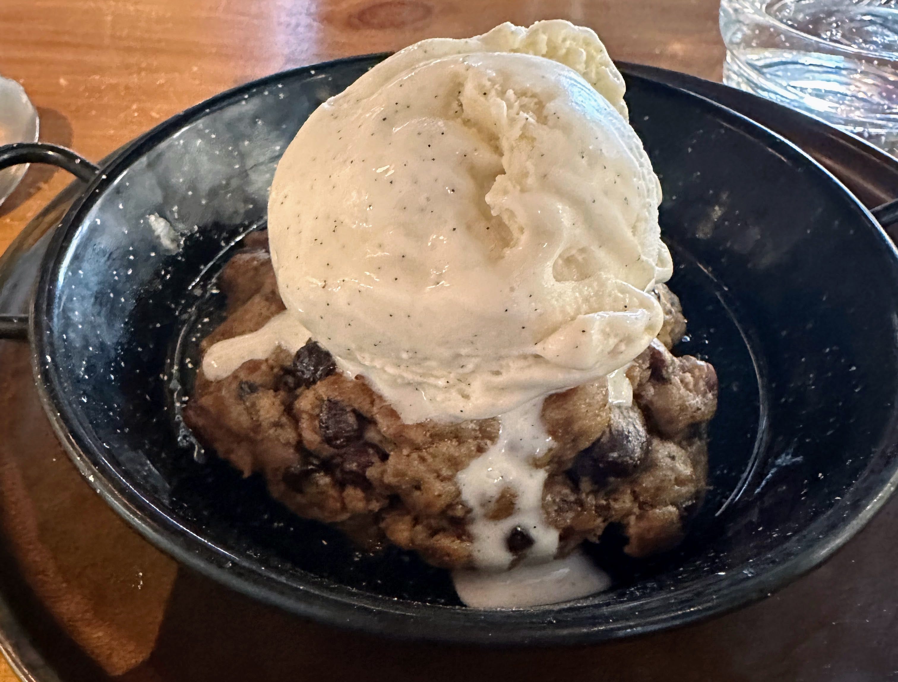 Il est servi dans un caquelon en fonte, chaud. Pas de goût de braise, mais un cookie un peu chaud orné d’une glace vanille. Rien à redire, c’est très simple et très gourmand.