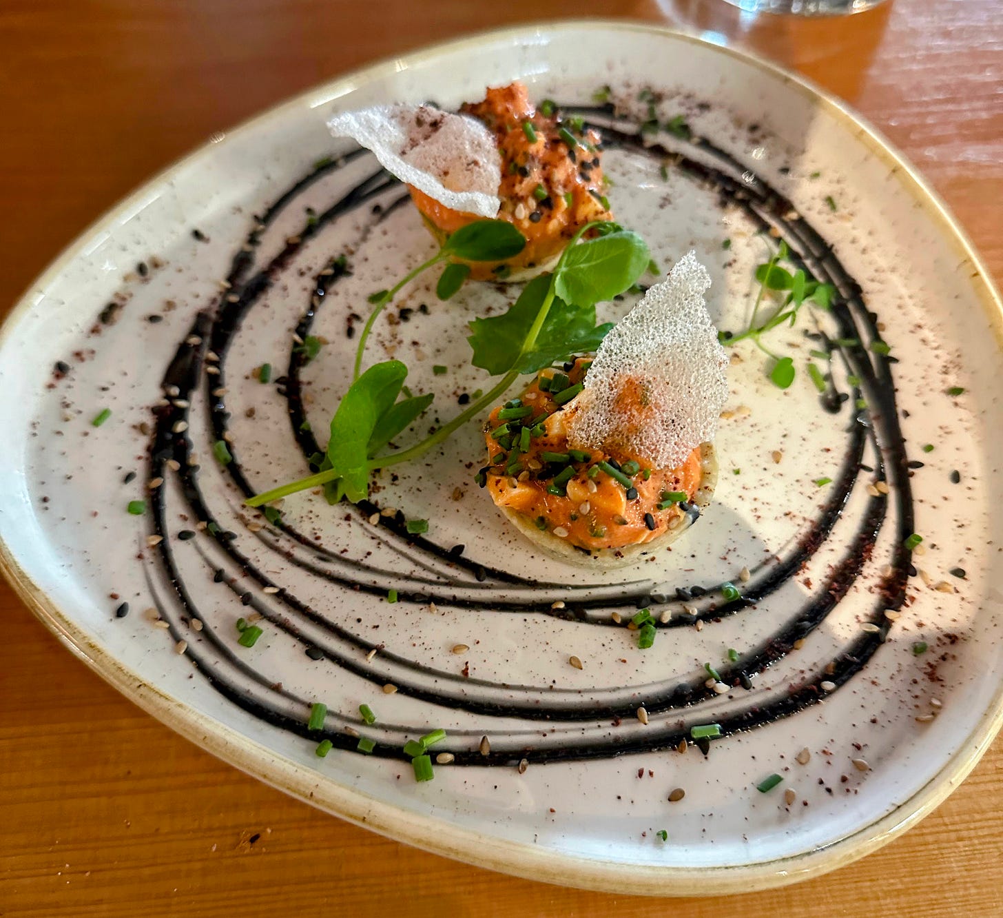 Après un peu trop d’attente, le tartare d’œuf et sa feuille de de riz soufflé atterrit devant moi. Certes l’intitulé ne ment pas, mais c’est un peu chiche. L’assiette fait de l’esbroufe avec ces enroulades de vinaigre balsamique, mais au final on y trouve un œuf mayo amélioré avec un morceau de feuille de riz. Mais est-ce que c’est bon ? Oui, heureusement.