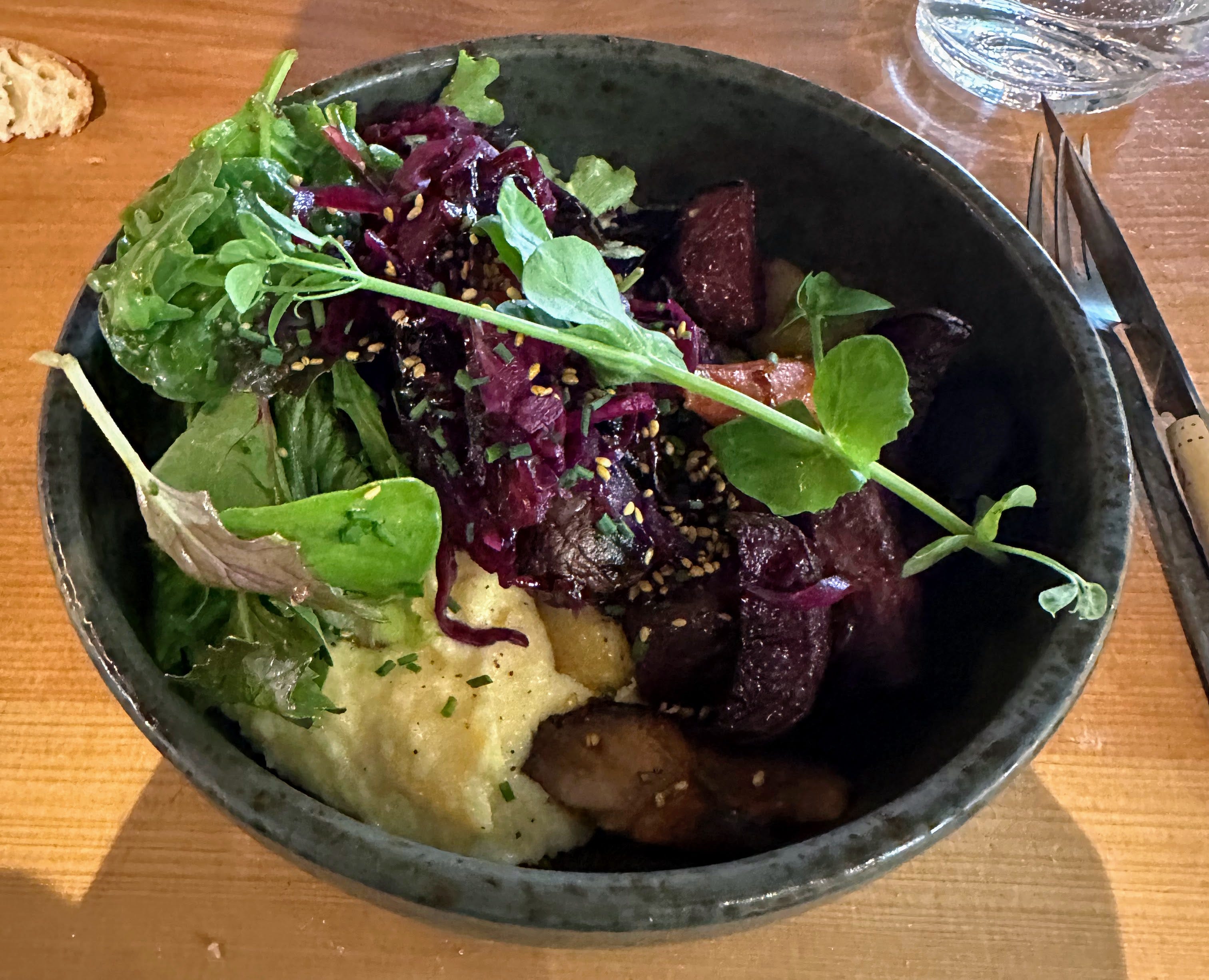 Le bol arrive. Costaud. Je plonge ma fourchette qui se noie sous la polenta. Les shiitakés sont bons, la réduction fonctionne. Franchement, c’est bon. L’absence de protéine est comblée par la générosité de la polenta, servie copieusement.