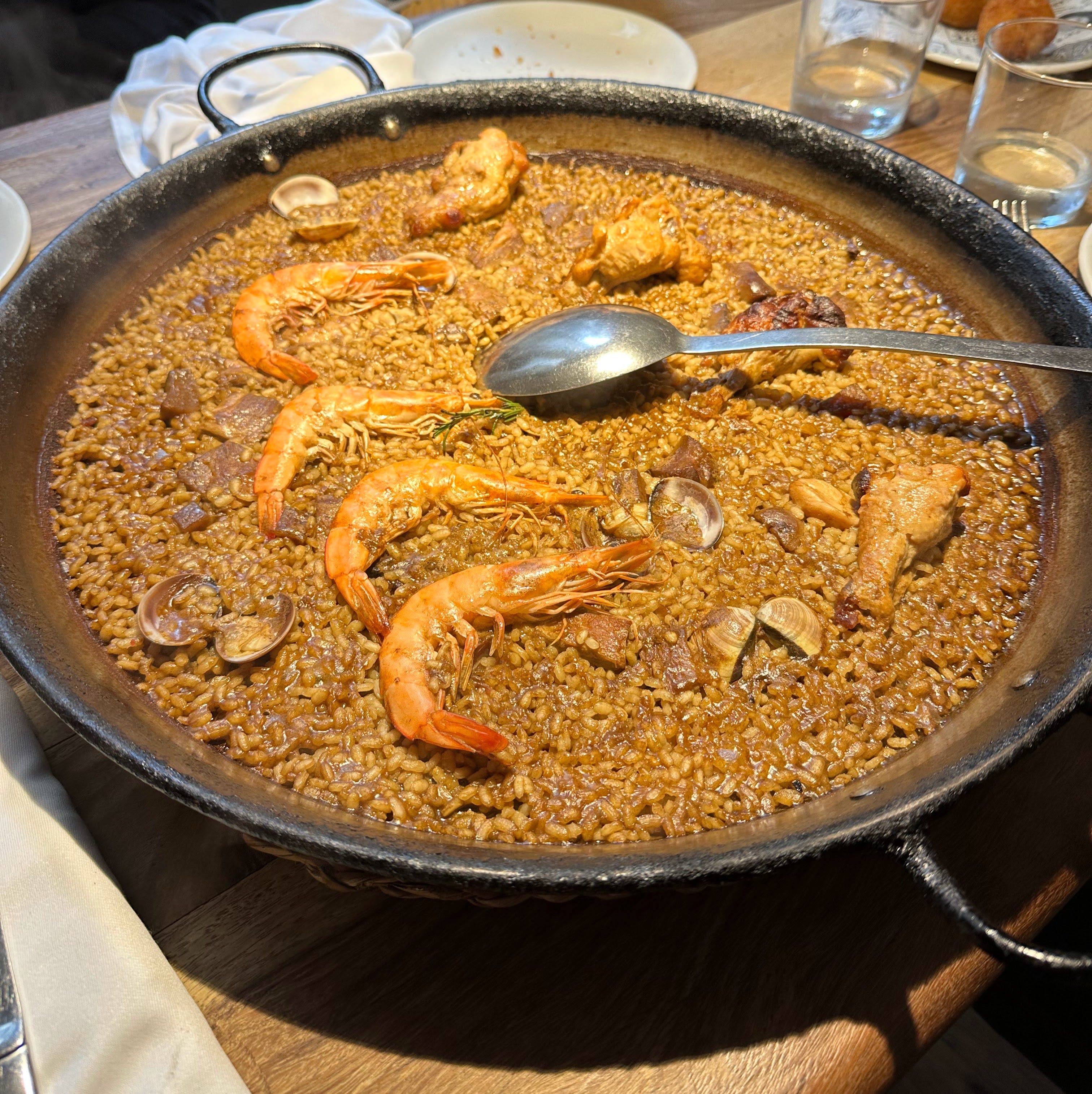 Le décor est là : une belle présentation dans cette grande poêle à paella, avec quelques palourdes, crevettes et morceaux de viande bien disposés. Le genre d’assiette qui te fait dire « OK, ça va être mémorable ». Mais le problème, c’est quand la réalité vient heurter cette belle illusion.